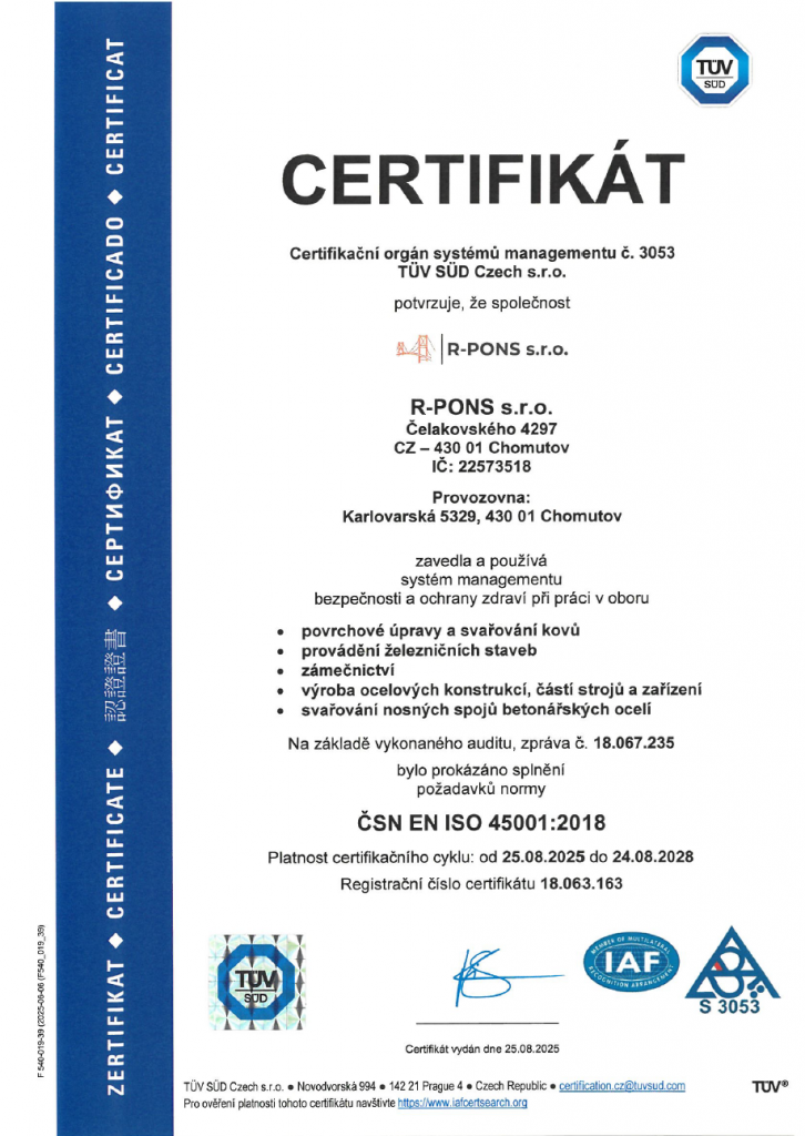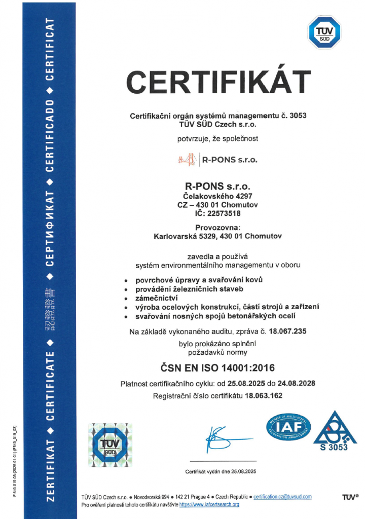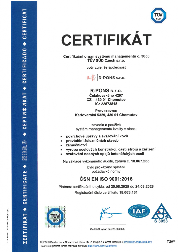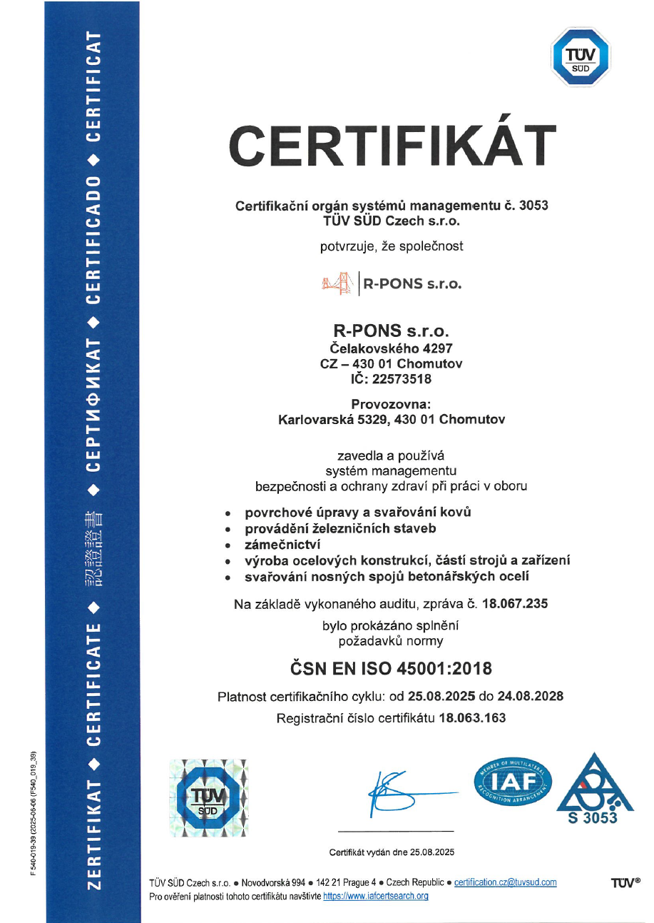 Společnost R-PONS s.r.o. je držitelem následujících certifikátů: